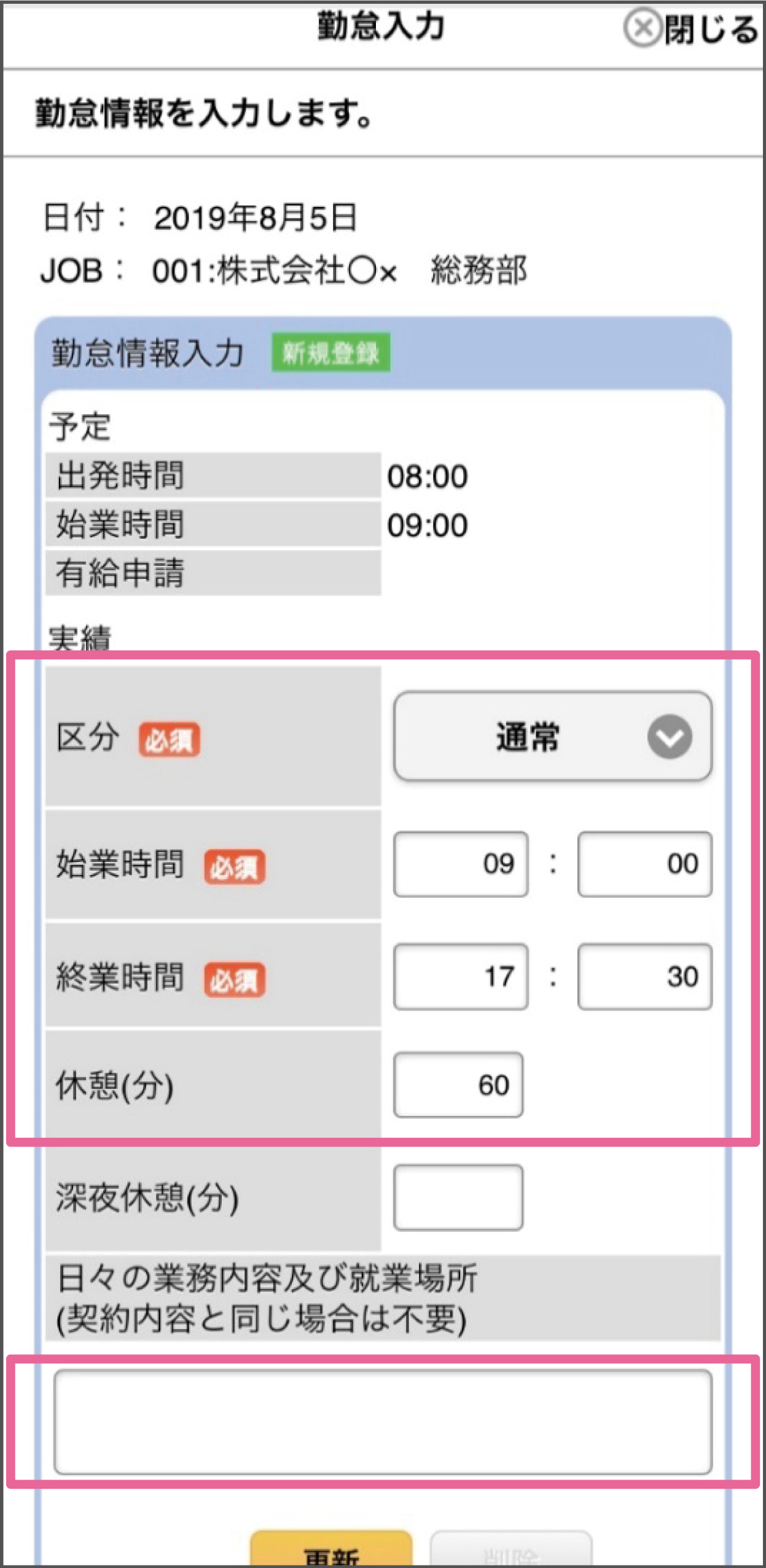 始業時間、終業時間、休憩時間(分)を入力してください。